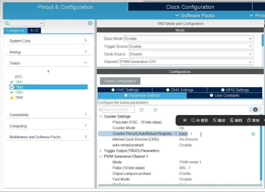 我们在开启一个定时器用来生产PWM波形。然后我们默认给一个500占空比的波形。我们不能直接用单片机驱动电机因为电流太小了,驱动不起来,我们可以加电机驱动模块,我这里用的是12V的电机所以用的就是L298N驱动模块。