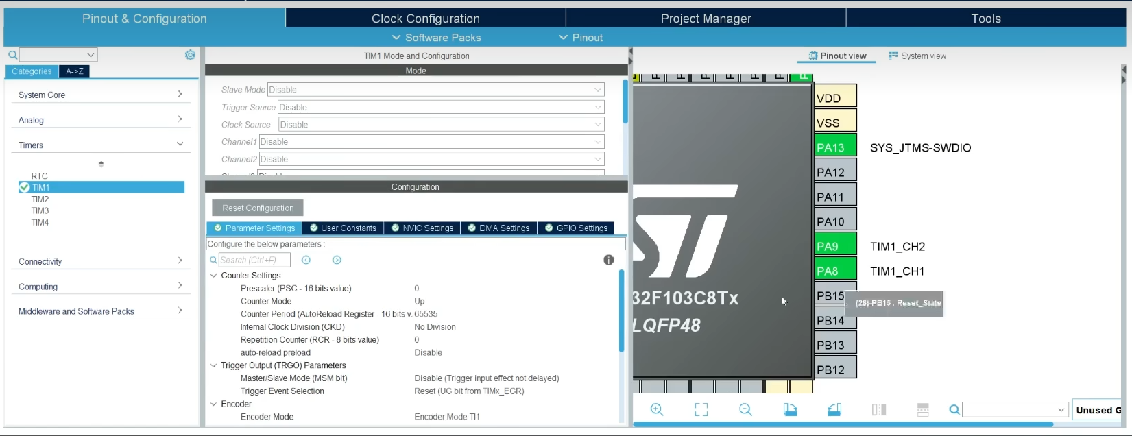 启动的是定时器的PA8和PA90预分频,最大计数65535,满量程之后我们进行程序编写,我们都了解过单片机的额定时器编码器模式,CNT是计数器,然后ARR是自动重装值,决定你能记录多少个数字。还需要注意编码器线程和计数模式,这些都是偏移量。比如说T1T2计数模式,来一个脉冲会记录两个数字,ab项就会记录四个。就是两个通道同时计数,如果选择T1,就是A计数,选择T2就是B计数。