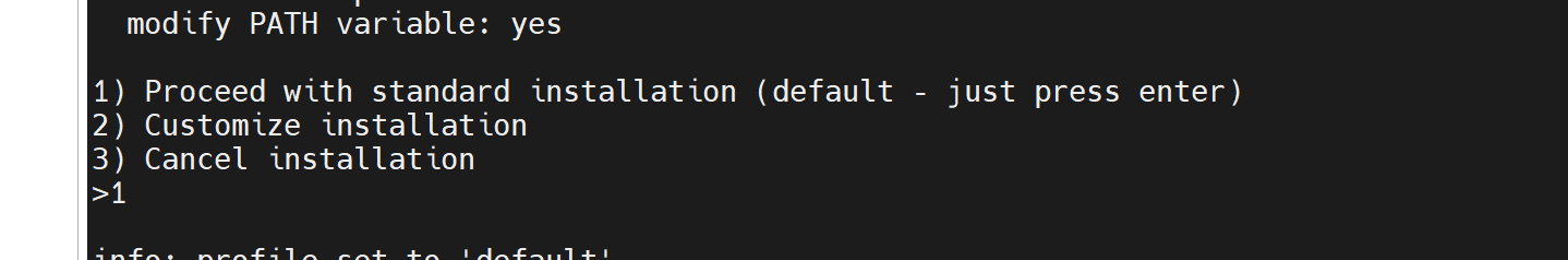 RUSTUP_DIST_SERVER用于指定安装RUST工具链的地址,如果是默认地址在国内会导致下载特别的慢RUSTUP_UPDATE_ROOT用于指定rustup指令的更新地址。- 遇到以下询问直接按回车即可