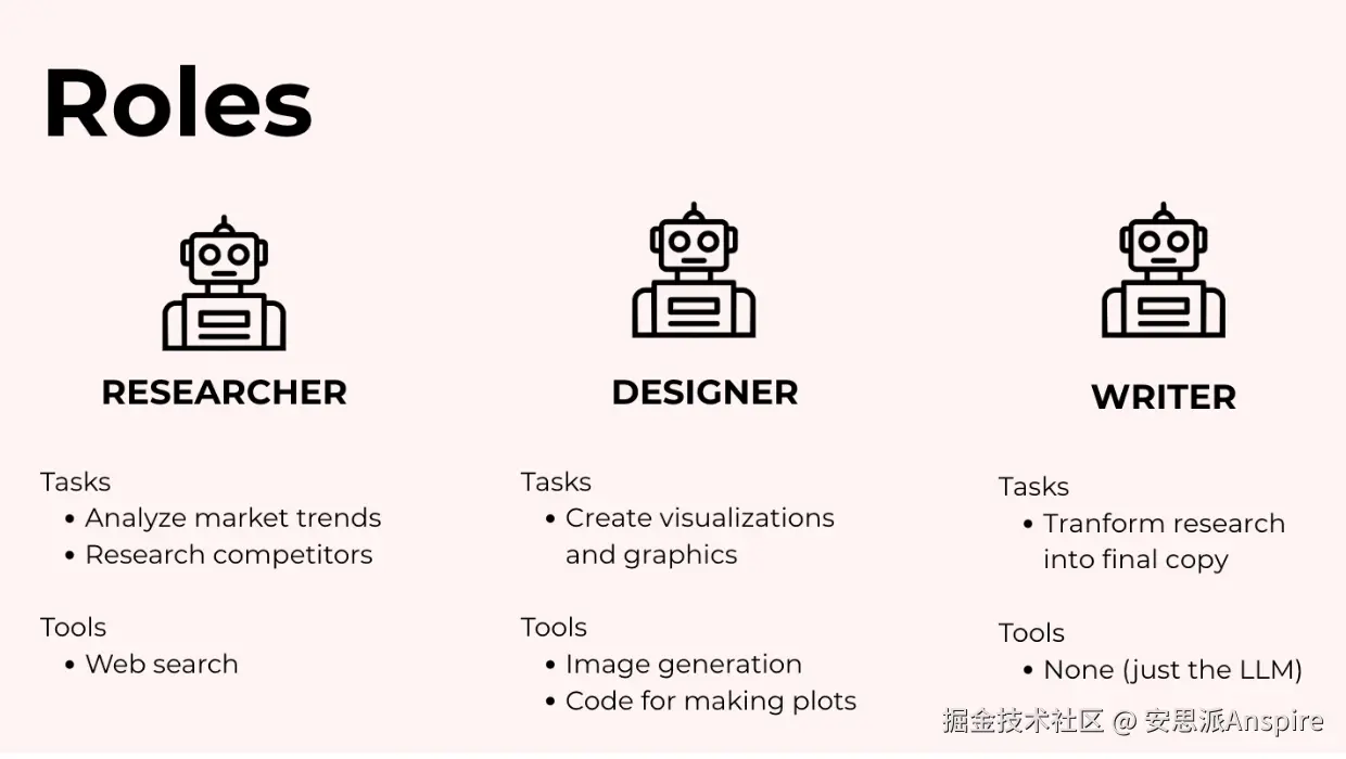 以及一位撰写代理,它将调查结果和素材转化为最终文案。这个代理可以仅仅是大语言模型本身,无需外部工具。
