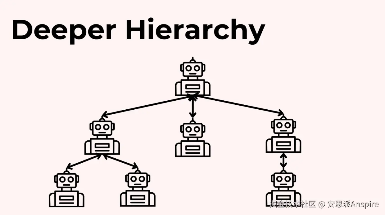 对于更复杂的工作流程,您可以拥有更深层次的层级结构,其中一些代理管理自己的子代理。