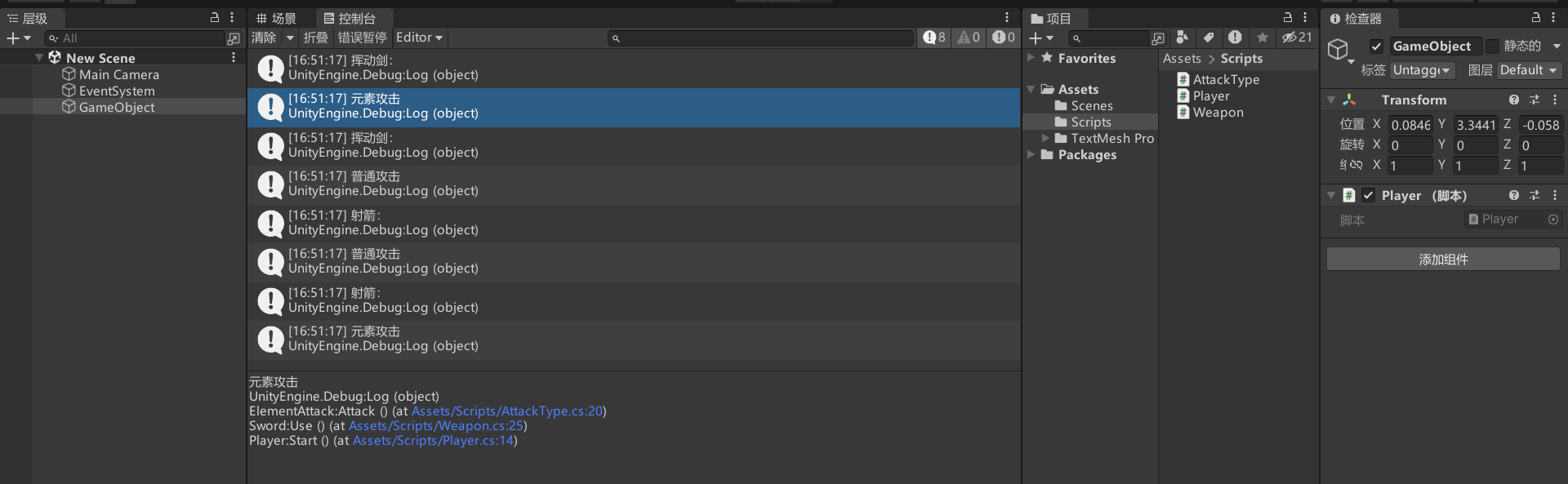 将玩家脚本加到场景中的空对象上,可以看到各个类型的武器和伤害都打印了出来。