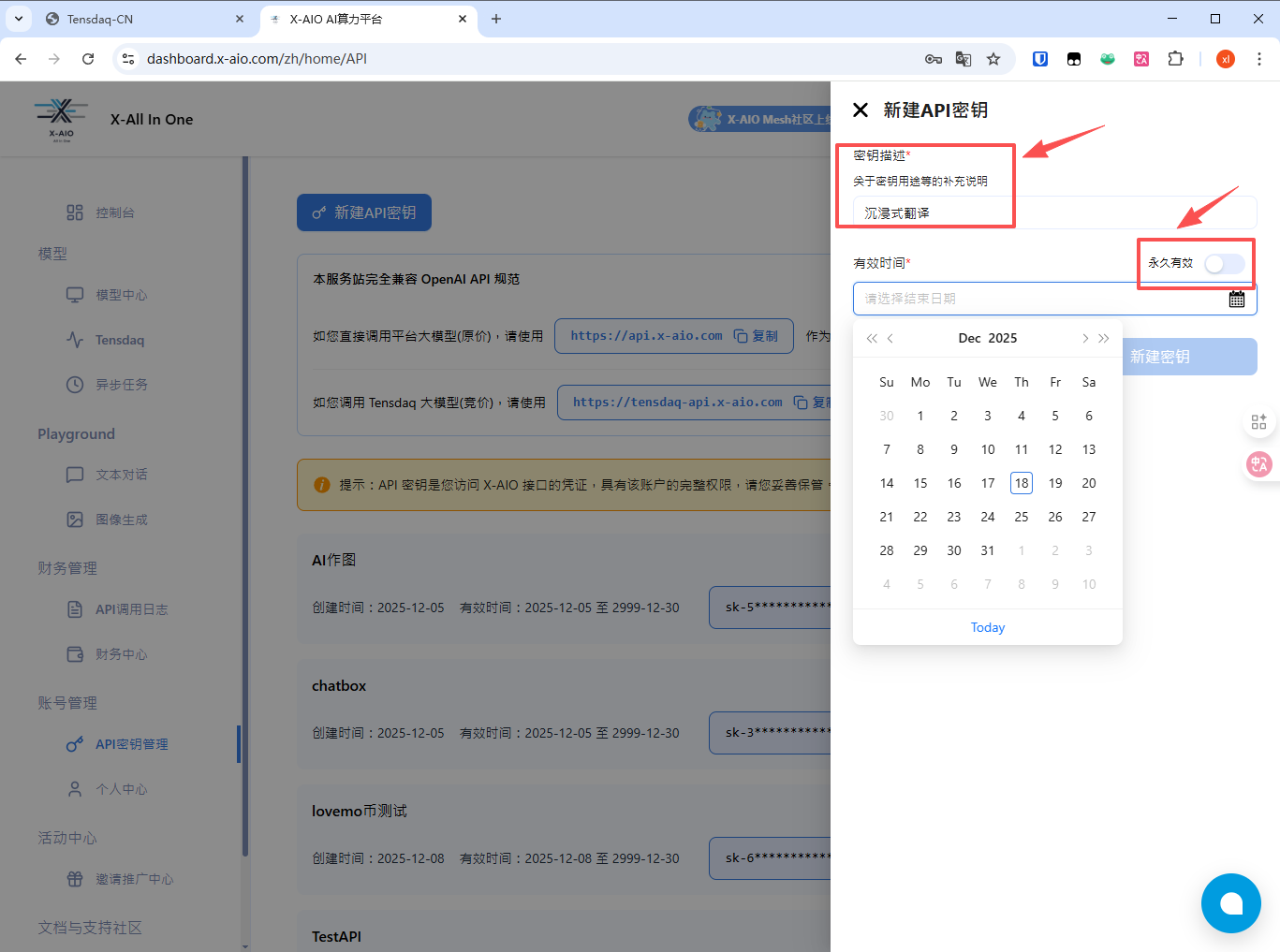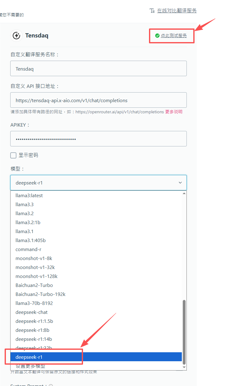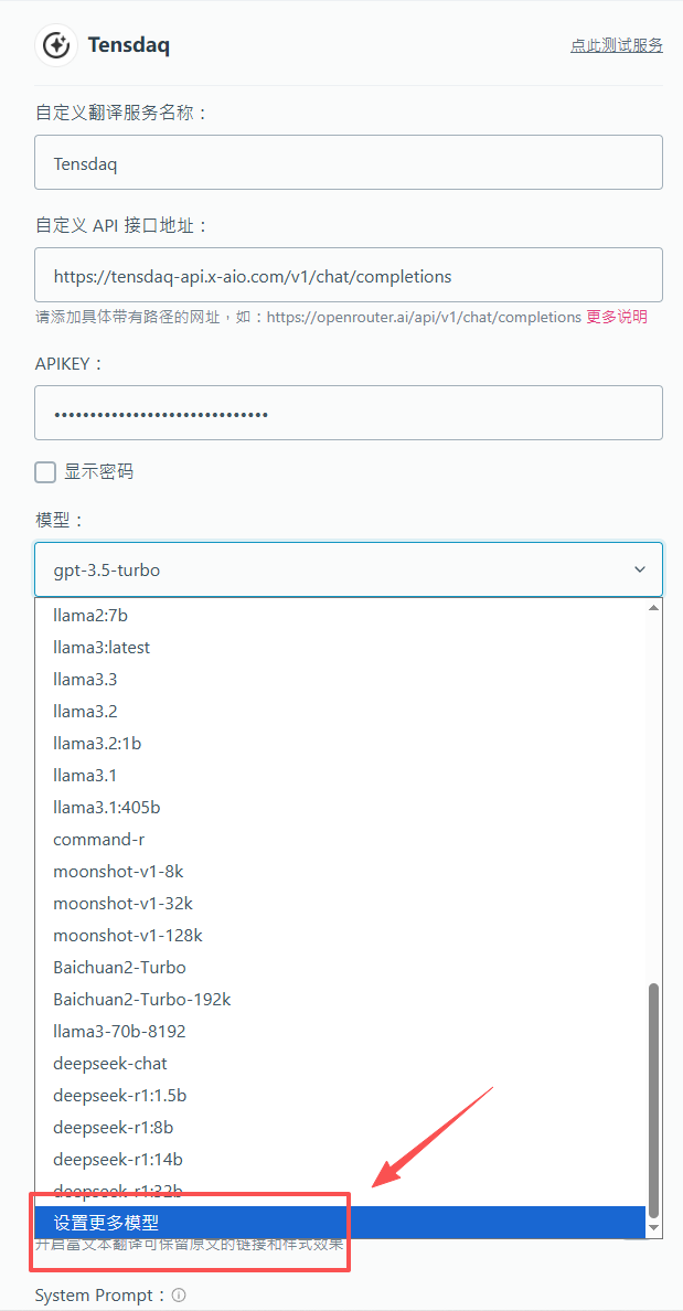 - 自定义API接口地址:https://tensdaq-api.x-aio.com/v1/chat/completions