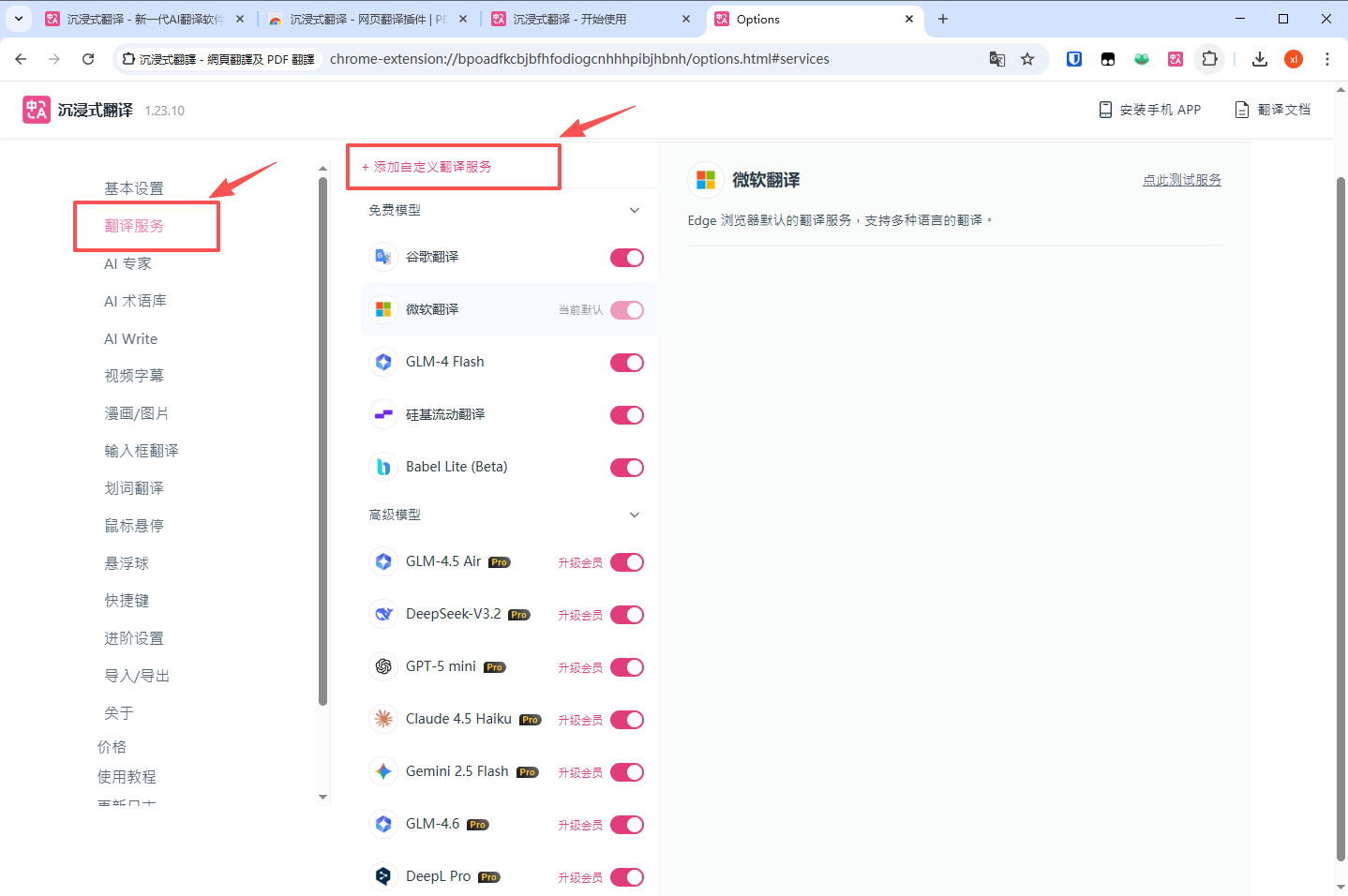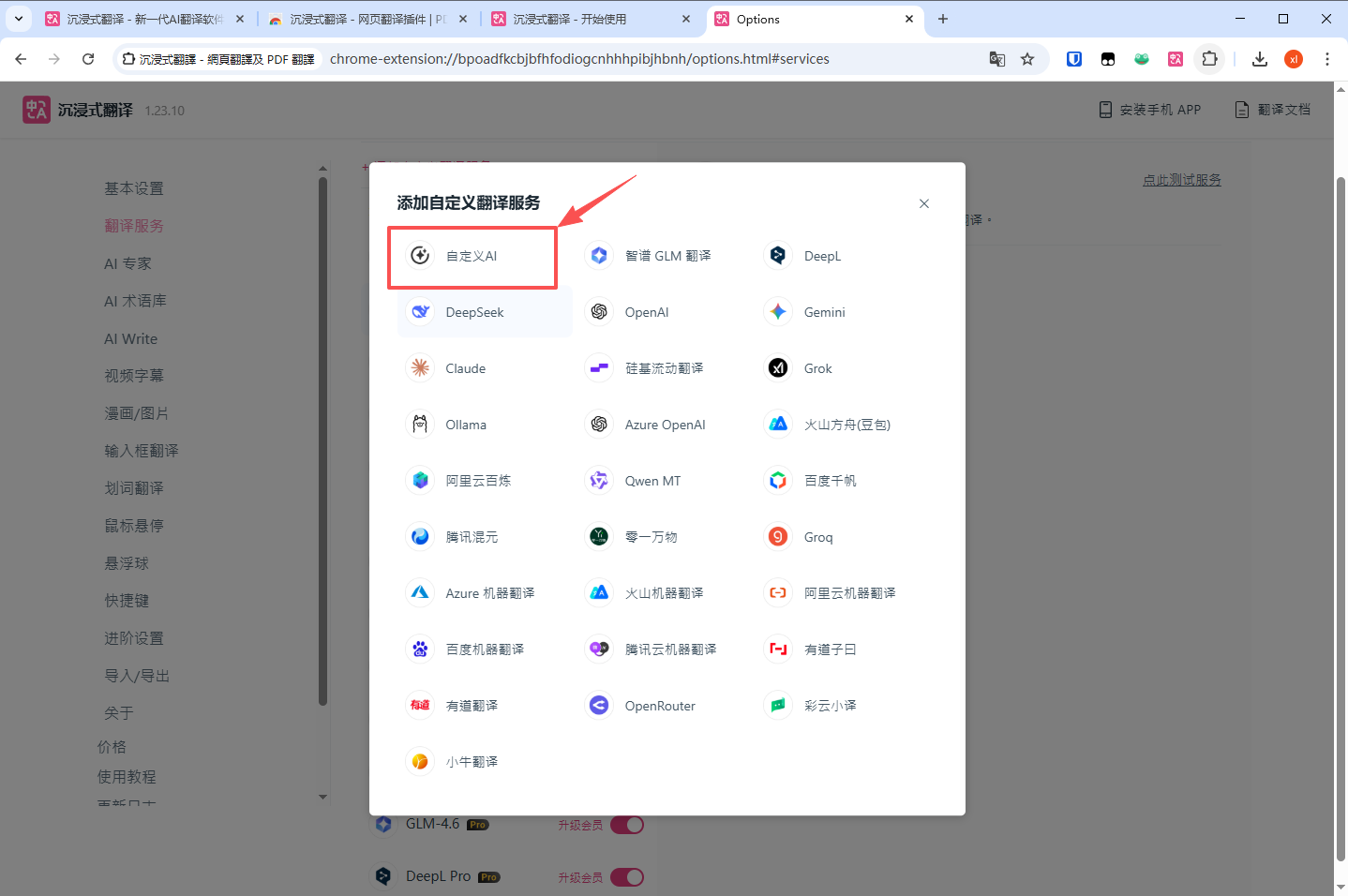 2.找到"沉浸式翻译"的侧边栏中找到【翻译服务】,点击【添加自定义翻译服务】。如下图所示: