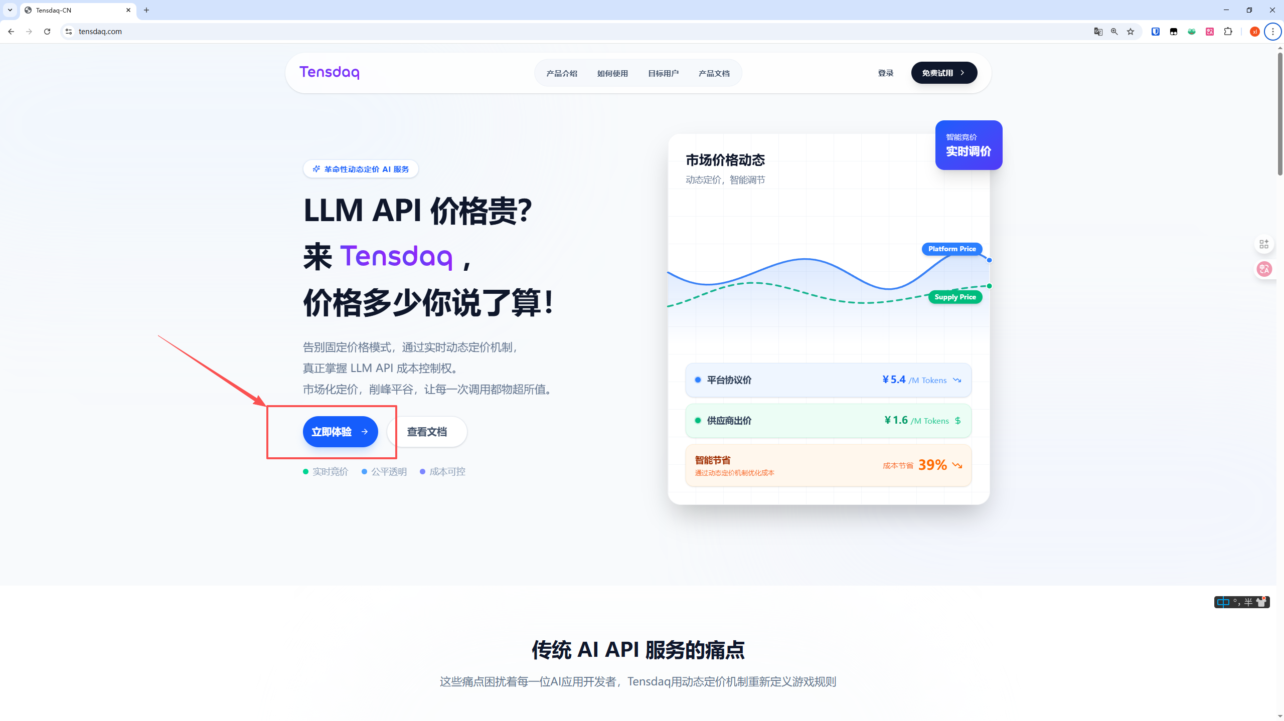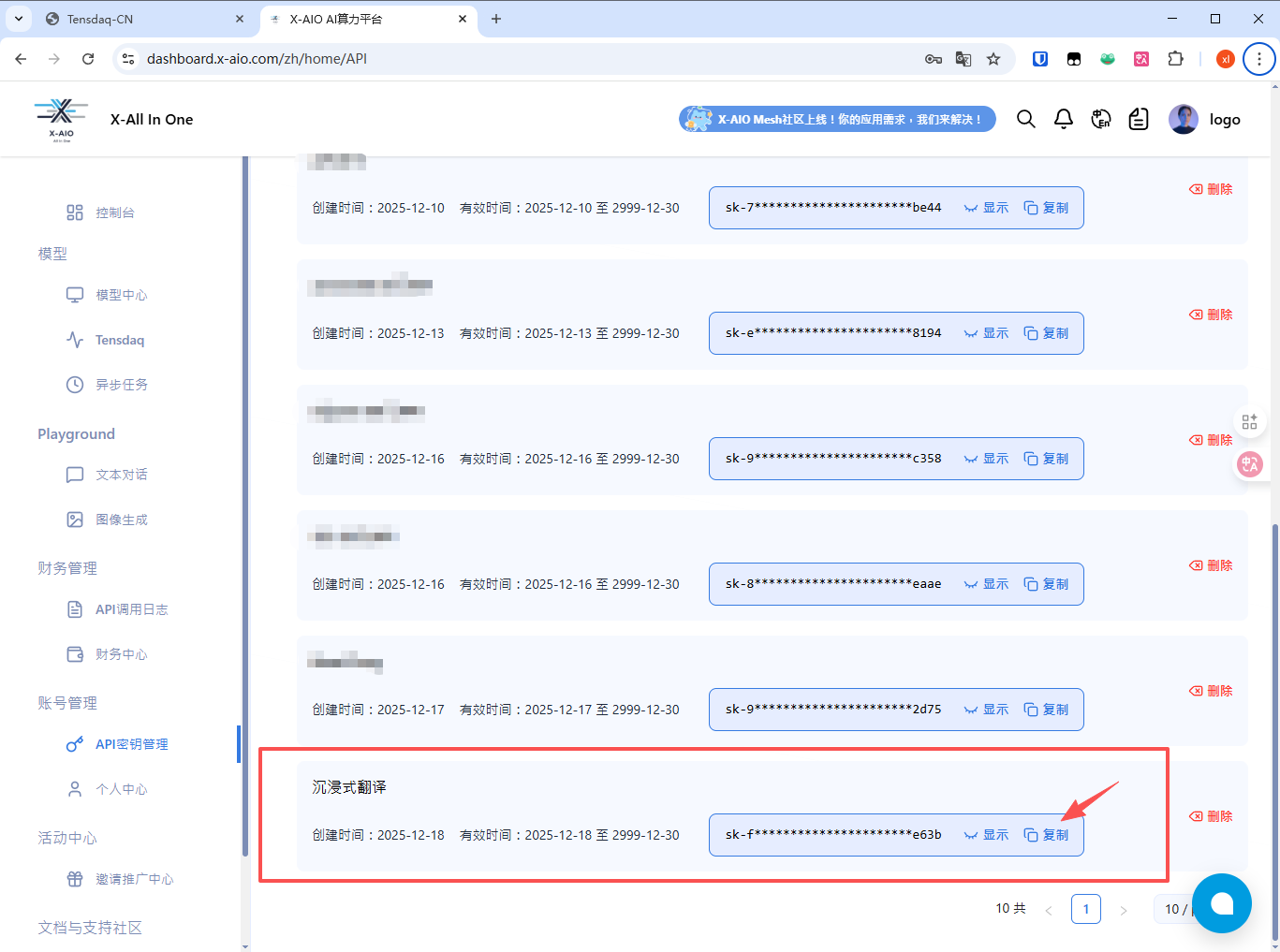 打开Tensdaq官网,注册并获取API密钥。如下图所示: