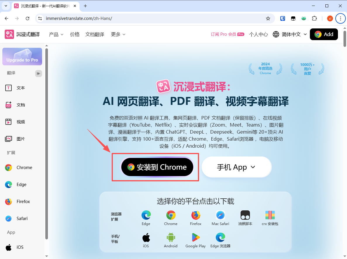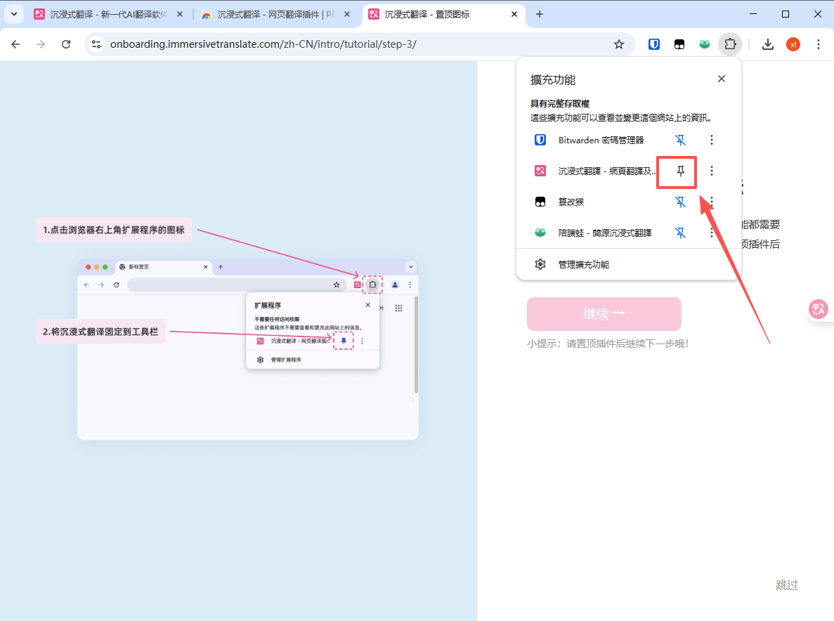 安装完成后,根据图片提示,将"沉浸式翻译"固定到工具栏。如下图所示: