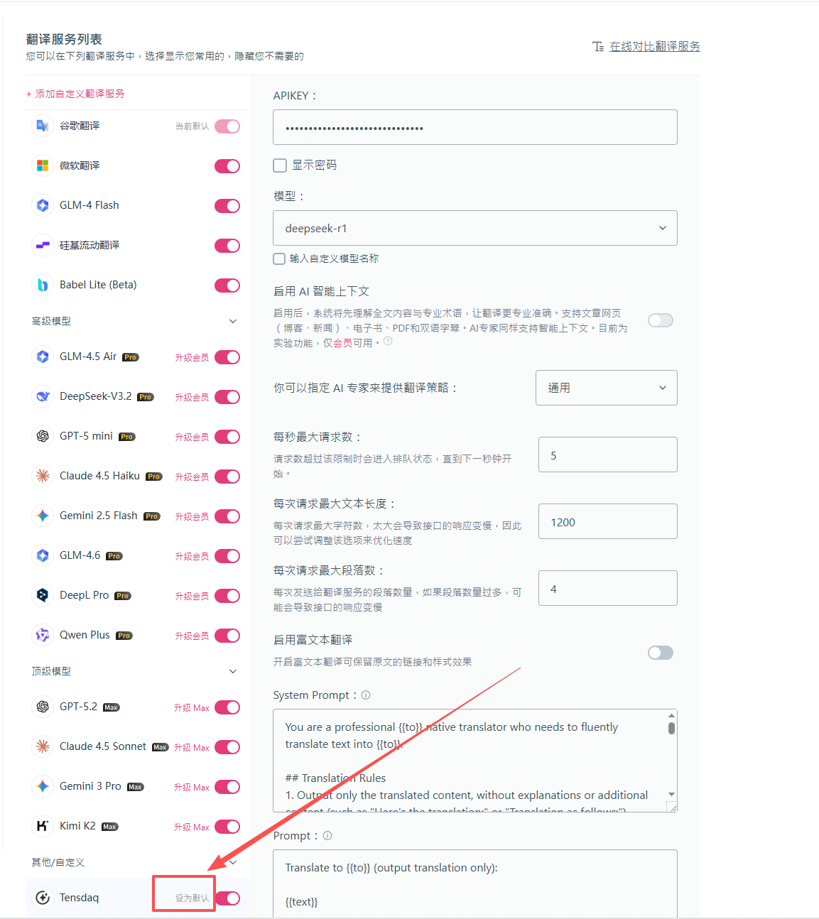 - APIKEY:粘贴在Tensdaq中创建的"沉浸式翻译"API密钥