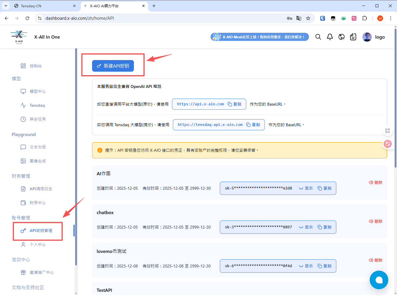1.注册完成后,在左上角侧边栏【API密钥管理】,创建密钥。如下图所示: