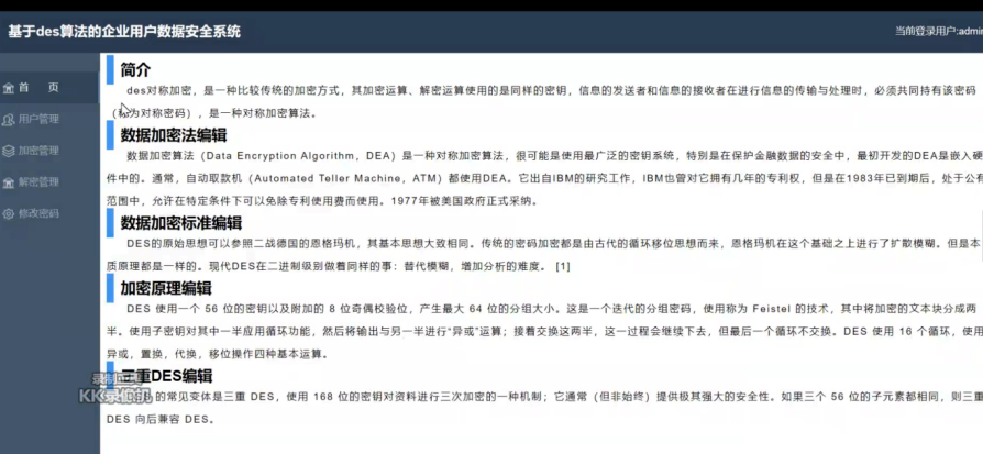 管理员管理界面的首页内容比较简单,本次没有设计其他的版块内容,是通过首页来进行DES算法的概念内容以及数据加密逻辑、加密标准的简单介绍,通过介绍能够加深本次的开发印象
