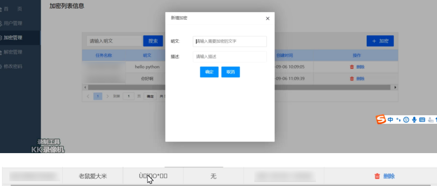 在加密模块中,可以在右侧的主界面中看到已经存在的加密的信息内容,另外还有添加加密的菜单键,通过添加加密可以弹出新的对话框,在对话框内容可以输入明文信息,并且可以对明文进行描述点击确定可以形成加密文件