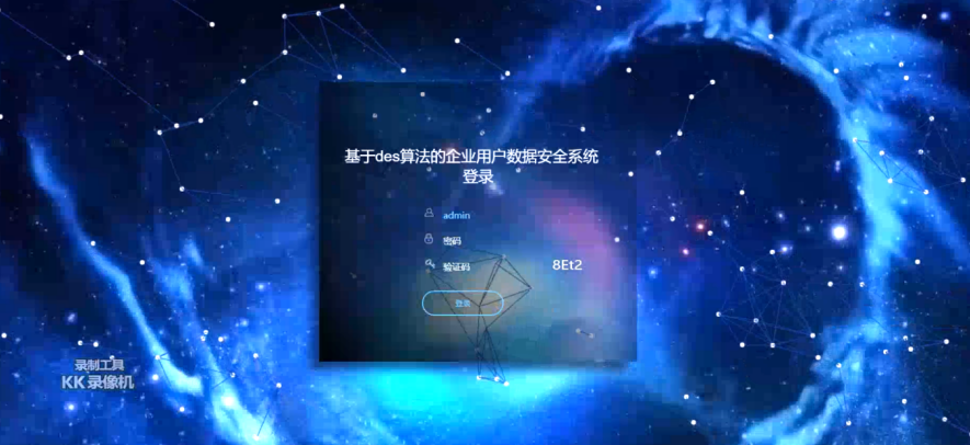 此次设计的基于des算法的企业用户数据安全系统的登录页面如下图所示,虽然此次设计的重点不在于页面设计,但是本次在页面设计也投入了一些精力,此次的背景图选择比较的科幻系,在登录框内的字体显示选择了白色,在暗色的背景下能够提供非常好的显示效果,登录的菜单栏选择用图表的形式进行展示,内容更加的生动