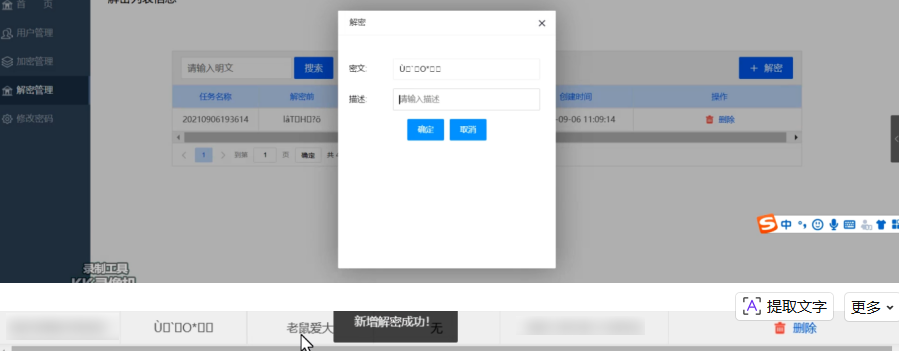 在解密模块中,通过点击解密,将上文中形成的"老鼠爱大米"对应的密文文件在该解密的密文框中进行输入,并且添加对应的描述内容可以实现正常的解密操作,如下图所示: