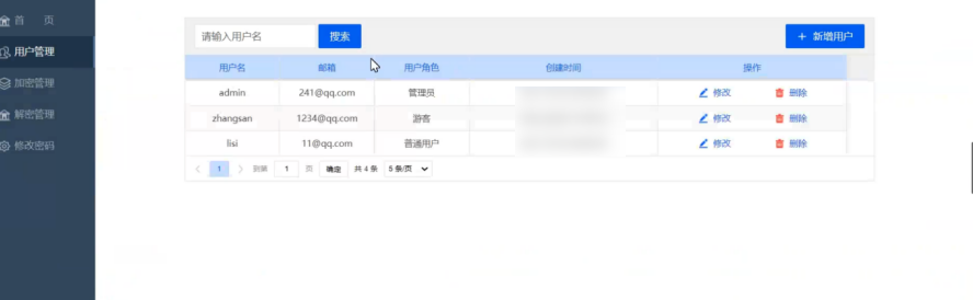 用户的管理界面中可以看到当下整个系统中存在的所有的用户列表,在列表中有用户名的信息内容、注册时使用的邮箱信息、用户的角色内容、创建的时间等,可以对所有的用户信息进行修改操作