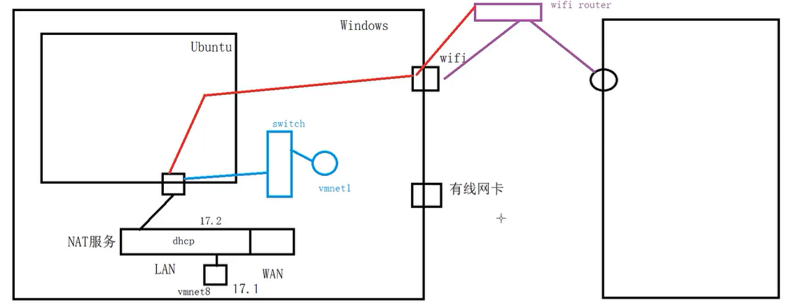 - 虚拟机如果要访问外网,需要配置网关 (只要不在一个网段的,就往网关丢),网关的地址必须是NAT路由器的LAN口IP(不能是windows的vmnet8)