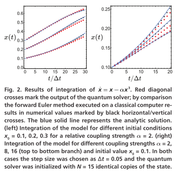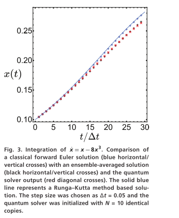 作者对模型 x ˙ ( t ) = x − α x 3 \dot{x}(t)=x-\alpha x^{3} x˙(t)=x−αx3进行了积分。使用 N=15 个副本运行量子求解器。