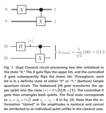 顶部展示了处理两个经典比特的电路,底部展示了包含Hadamard门和CNOT门的简单量子电路,生成了纠缠态 ∣ ψ f i n a l ⟩ = 1 2 ( ∣ 00 ⟩ + ∣ 11 ⟩ ) |\psi_{final}\rangle = \frac{1}{\sqrt{2}}(|00\rangle + |11\rangle) ∣ψfinal⟩=2 1(∣00⟩+∣11⟩)