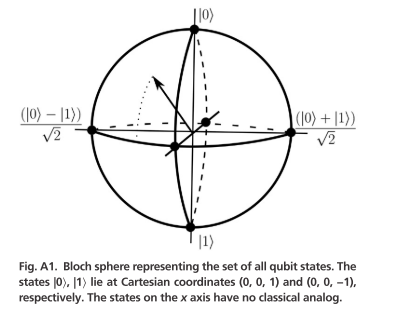 展示了单个量子比特的所有可能状态,其中 ∣ 0 ⟩ |0\rangle ∣0⟩ 和 ∣ 1 ⟩ |1\rangle ∣1⟩ 位于两极,赤道上的状态代表叠加态。