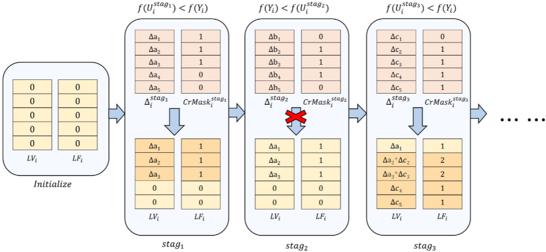 DLS-DE 引入差分向量学习策略,在个体停滞阶段从具有改进潜力的试验向量中提取有效差分信息,并在交叉掩码约束下累积关键维度的方向知识;一旦个体更新成功即重置学习信息。该机制为试验向量生成提供自适应方向引导,有效缓解个体停滞并提升搜索能力。