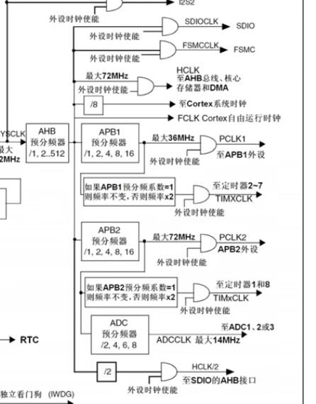- PLLCLK:PLL 输出时钟(比如选 HSI/2(4MHz)×16 → 输出 64MHz;选 HSE(8MHz)×9 → 输出 72MHz);