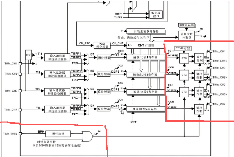 我圈出的区域是高级定时器的 "刹车功能 + 死区生成" 模块,这是高级定时器特有的、用于电机驱动等场景的核心安全 / 控制功能,分两部分解释: