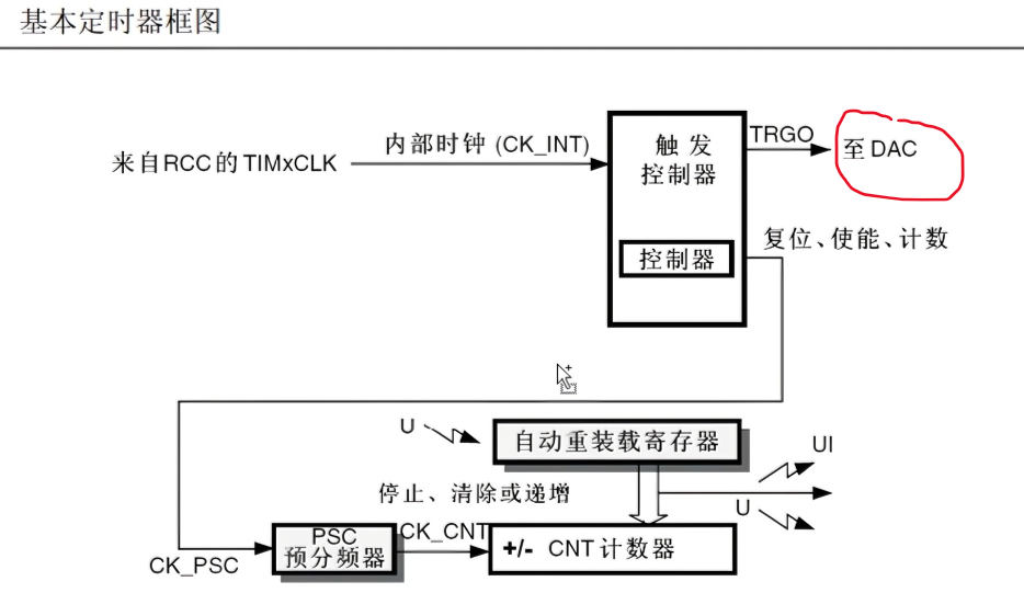 - 基本定时器通过 "主模式" 可以定时产生触发信号(TRGO 信号),每当定时器定时完成一次,就给 DAC 发一个 "更新指令",让 DAC 切换到下一个数字值。