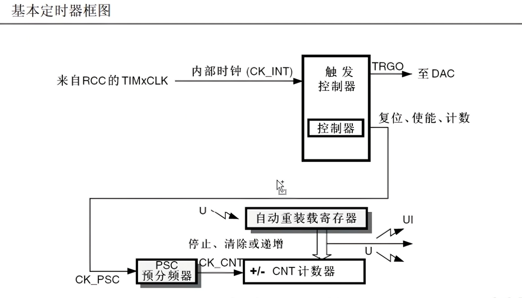 最后就是这个自动重装载寄存器,他可以设置一个值,如果CNT在自增的时候值达到了这个值,就会触发后面的UI,也就是更新中断,这个更新中断之后就会通往 NVIC, 我们再配置好 NVIC 的定时器通道就会给CPU响应,UI下面的通道是更新事件,他不会响应CPU,但是他会响应其他的电路的工作