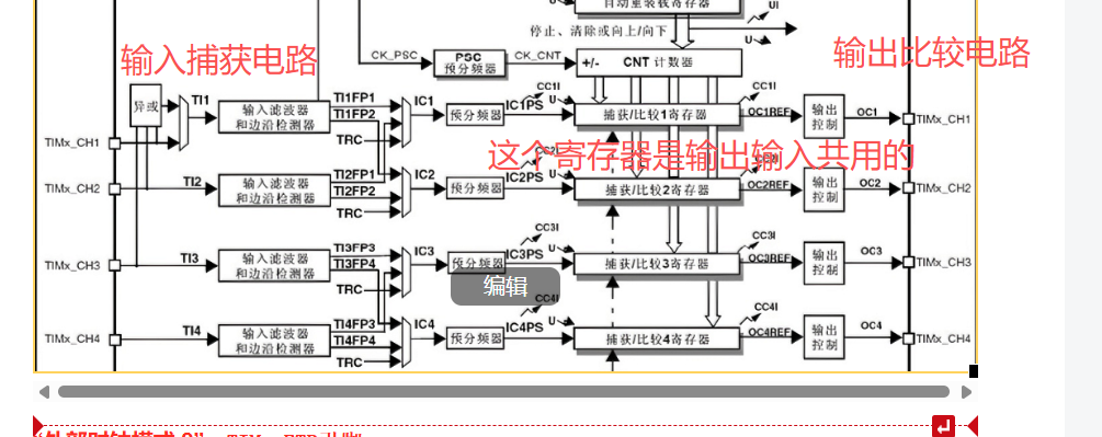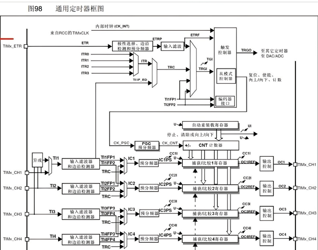 TIMx_ETR引脚:定时器的专属外部触发引脚(比如 TIM2 的 ETR 对应 PA0);ITR0~ITR3:来自其他定时器的内部触发信号(比如 ITR1 可以接 TIM1 的触发输出)- TI1F_ED:TIMx_CH1的边沿(也就是下方TIMx_CH1通过边沿到TI1F_ED,这个无论是上升沿还是下降沿都是可以的)