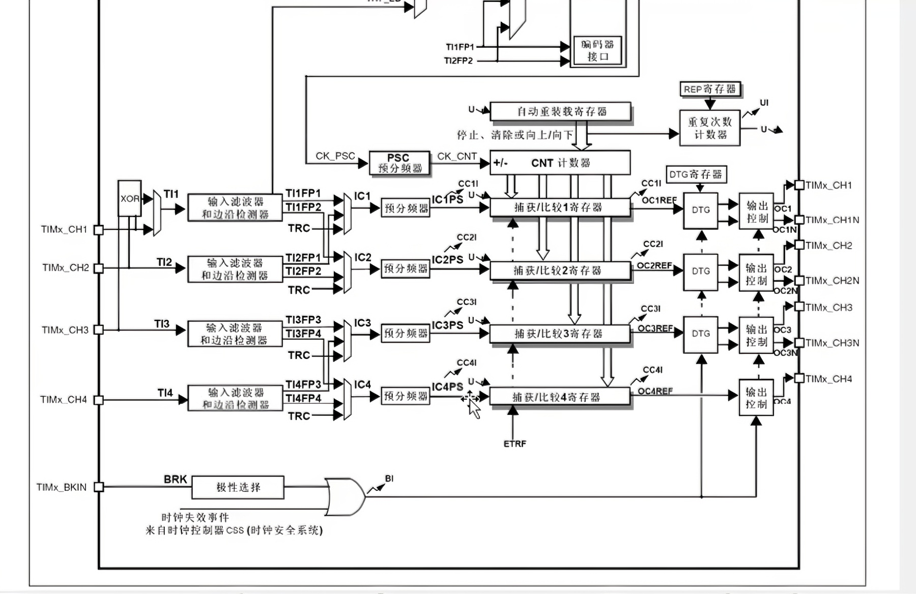 不仅具备基本的定时中断功能,而且还包含内外时钟源选择、输入捕获、输出比较、编码器接口、主从触发模式等多种功能
