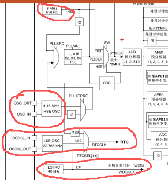 - HSE OSC:外部高速晶振(4-16MHz,接 OSC_IN/OSC_OUT 引脚),比 HSI(内部时钟) 更稳定,但是如果要求不大就可以选择内部时钟;