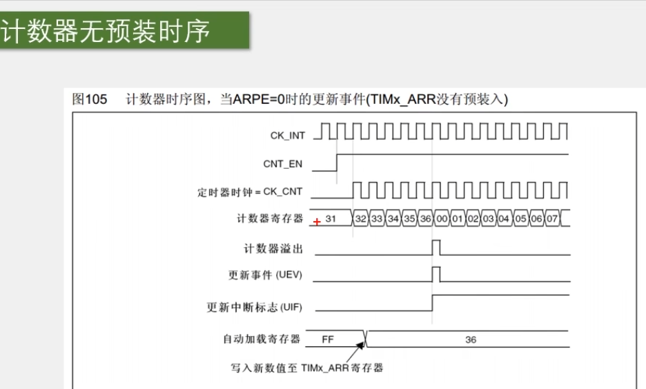 "计数器无预装时序" 对应的是定时器中自动重装寄存器(ARR)的 "无预装载模式" ,核心是理解ARPE位(自动重装预装载使能位)的作用,下面分细节讲: