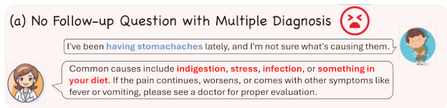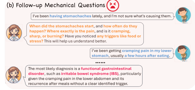 医生资源严重短缺,医疗资源紧张。大模型的出现极大的提高了获得医疗咨询的机会。然而,现在的大模型临床咨询仍然面临问题:它们无法通过对话互动引出患者最相关的医疗状况。大模型往往仅根据用户最初的输入来输出结果,而没有进一步的询问。这与现实世界中的门诊不同,在现实世界中,患者往往很难在一开始提供所有相关信息,需要医生的一步步询问来引导患者说出更多的情况。