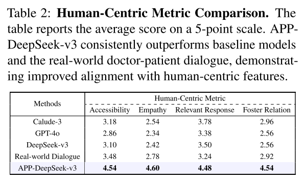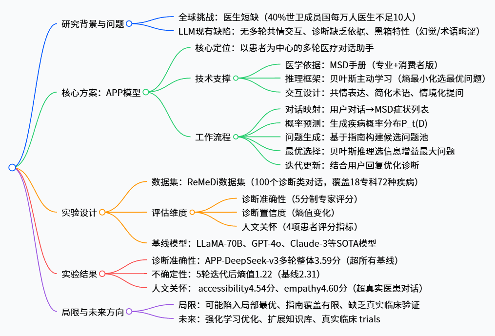 为解决全球医生短缺导致的医疗可及性问题,同时克服现有大语言模型(LLMs)在临床对话中缺乏以患者为中心的交互、诊断缺乏权威性依据和透明度不足等缺陷,研究团队提出Ask Patients with Patience(APP) 医疗助手模型。该模型基于权威医学指南(如 MSD 手册) 和贝叶斯主动学习,通过多轮共情对话引导患者清晰表达症状,动态更新疾病概率分布以提升诊断准确性;同时构建了基于 300 + 真实医患对话的基准测试集,经实验验证,APP 在诊断准确率(多轮场景下整体 3.59 分 / 5 分) 、不确定性降低(迭代 5 次后熵值降至 1.22) 和人文关怀维度(各项指标均超 4.5 分 / 5 分) 上显著优于 GPT-4o、Claude-3 等现有 SOTA 模型,为 AI 医疗对话与实际临床应用搭建了桥梁。