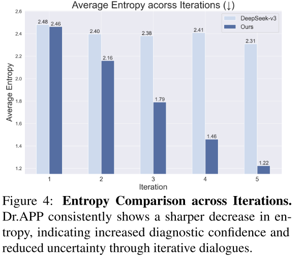 • 熵值:评估诊断置信度。 H t = − ∑ i = 1 I P ( d i ) ⋅ l o g P ( d i ) H_{t}=−\sum\nolimits_{i=1}^{I} P (d_{i} ) · logP (d_{i}) Ht=−∑i=1IP(di)⋅logP(di) 。对比不同模型在迭代过程中熵值的下降速率,验证 Dr.APP 的不确定性降低效率