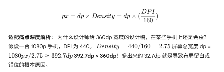 很多开发者习惯了使用 dp,但鲜少有人能从底层推导其渲染逻辑。要彻底理解适配,必须先厘清决定屏幕显示的三个核心物理量。