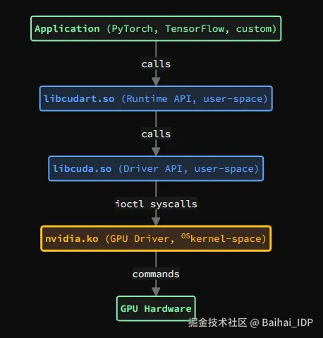 这种职责分离使应用程序能使用统一的高层 API,而后端负责处理与硬件相关的具体细节。libcudart 将 Runtime API 调用转换为 Driver API 调用,再由 libcuda 通过(OS)kernel 驱动执行。