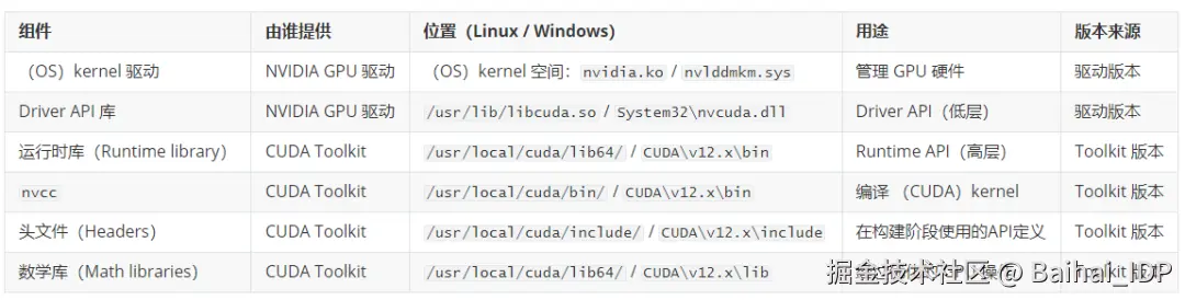 - 其版本与 GPU 驱动程序版本绑定(例如,driver 535.x 提供支持 CUDA Driver API 12.2 的 libcuda.so/nvcuda.dll)。