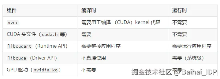 - 运行时需要运行时库(libcudart),但不需要 nvcc 和头文件。