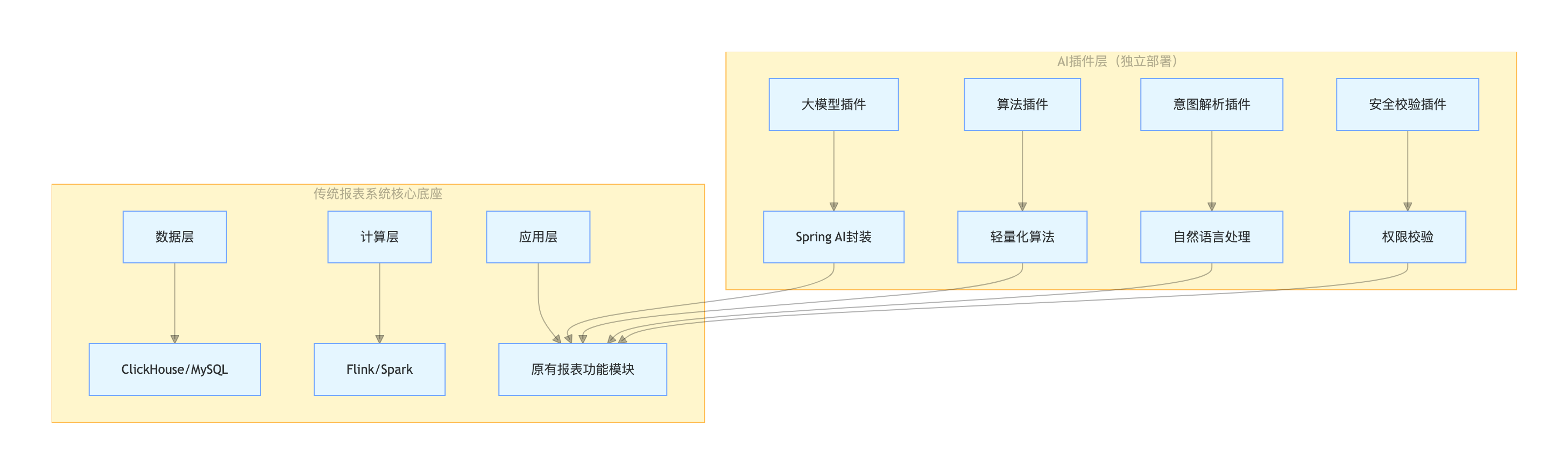 | 工程化支撑 | 插件化框架(如 Spring Boot Starter)+ 配置中心(Apollo) | 独立部署 AI 能力,动态调整参数 | 低(复用报表现有工程化体系) |
