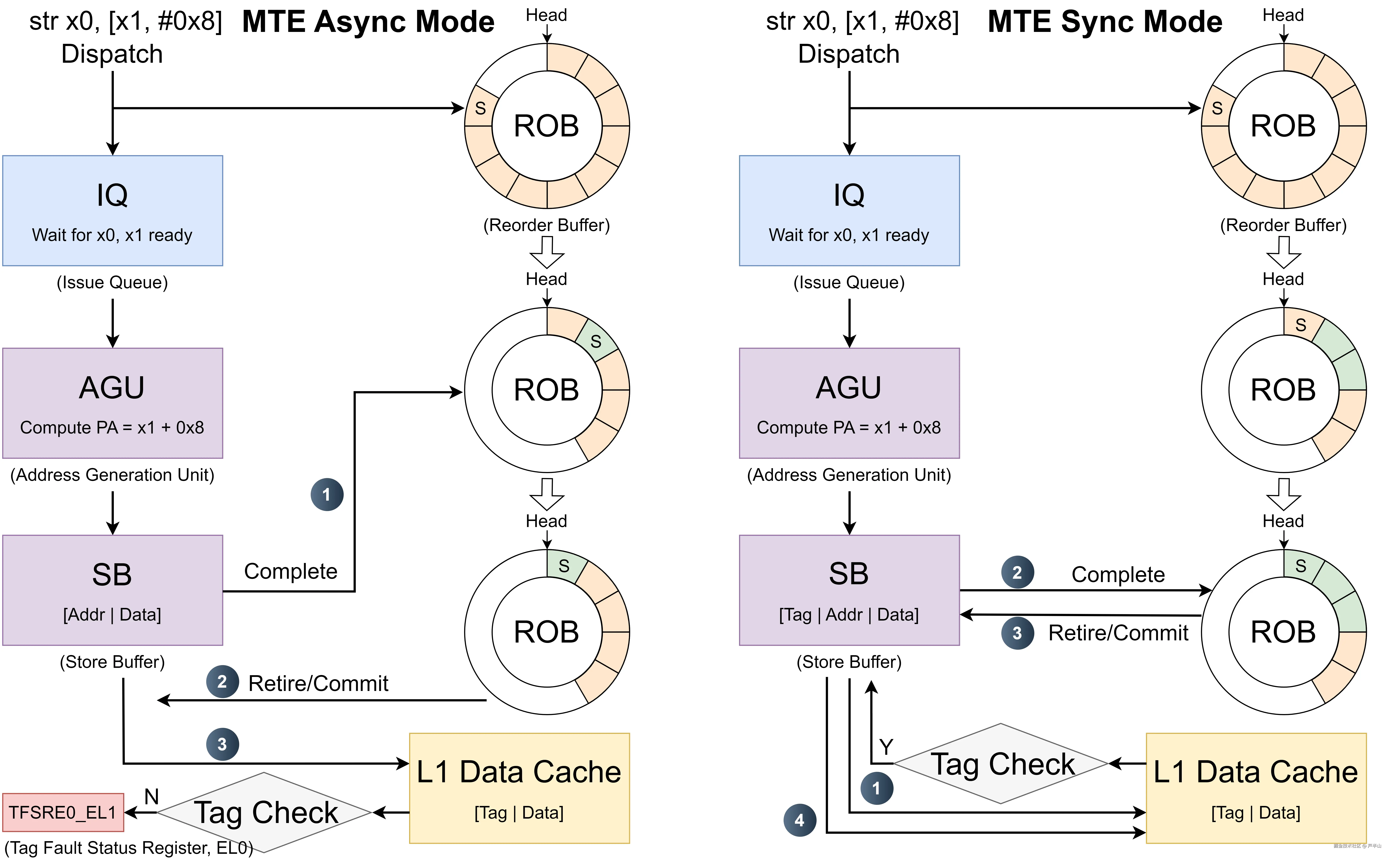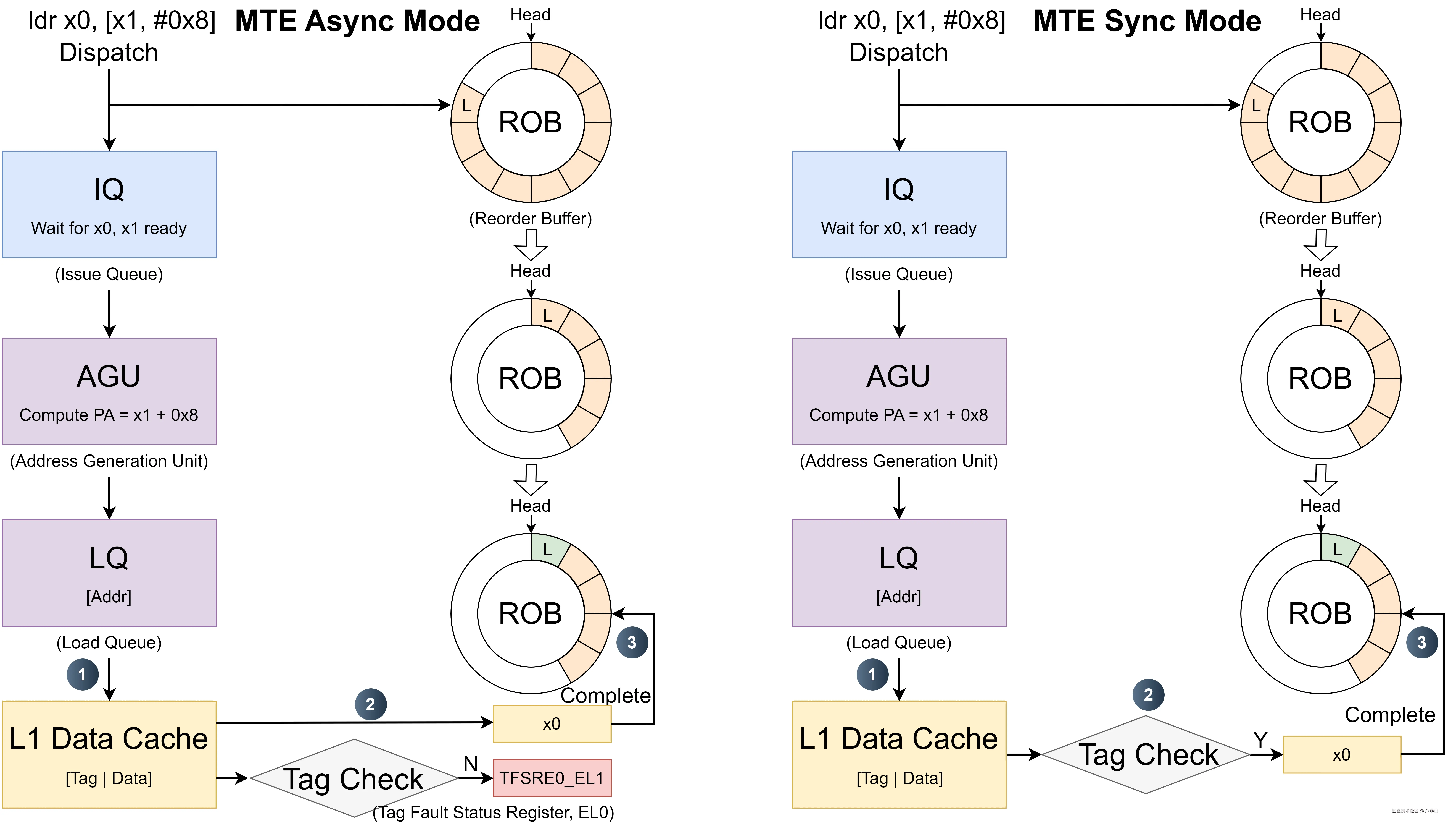 从设计哲学来看,同步模式代表了安全优先的终极形态。MTE的初衷是遏制攻击,而最理想的防御,就是在异常发生时彻底熔断,确保CPU停留在访问异常的那条指令上,而没有任何一条后续的指令被执行,从而切断攻击链。相比之下,异步模式更像是现实主义的妥协(苹果在MIE的文章里表达过对异步的"鄙视")。同步模式的性能开销过大,导致它在生产环节中无法使用。因此异步选择了一种"先执行,后追责"的策略:让流水线全速奔跑,转而将Tag检测作为一种旁路机制,且只在进入内核时才结算。这种设计牺牲了报错的精确性,但却换取了流水线的高速运转,可以适用于生产环节。