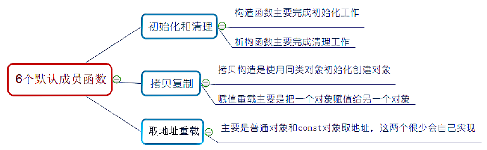 默认成员函数就是用户没有显式实现 ,编译器会自动生成的成员函数 称为默认成员函数 。一个类,我们不写的情况下编译器会默认生成以下6个默认成员函数,需要注意的是这6个中最重要的是前4个,最后两个取地址重载不重要,我们稍微了解一下即可。其次就是C++11以后还会增加两个默认成员函数,移动构造 和移动赋值 ,这个由于涉及到C++后面的知识我们之后再进行讲解。默认成员函数很重要,但也比较复杂,我们要从两个方面去学习: