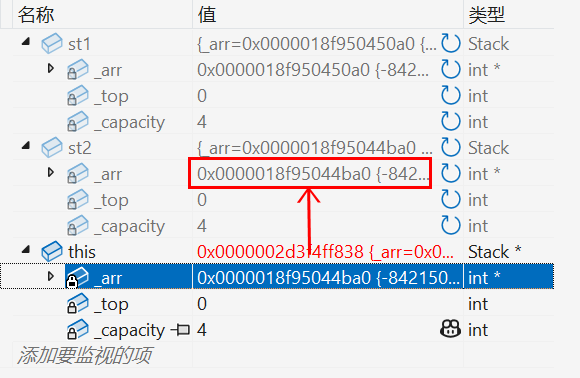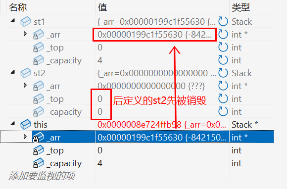 那我们怎么证明呢?这就需要用到前面学习到的 this 指针了,由于析构函数也隐含有 this 指针,所以我们可以通过 this 指针在调试中查看谁先被释放空间: