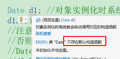 由于此时我们写了带参的构造函数,所以编译器不会默认生成构造函数,但由于带参的构造函数并不是默认构造函数,所以就会报这样的错误。而通过前面的代码我们就知道当写了无参构造函数后程序可以运行,所以能说明无参构造函数是默认构造函数。而全缺省构造函数也是如此,这里就不重复证明了。