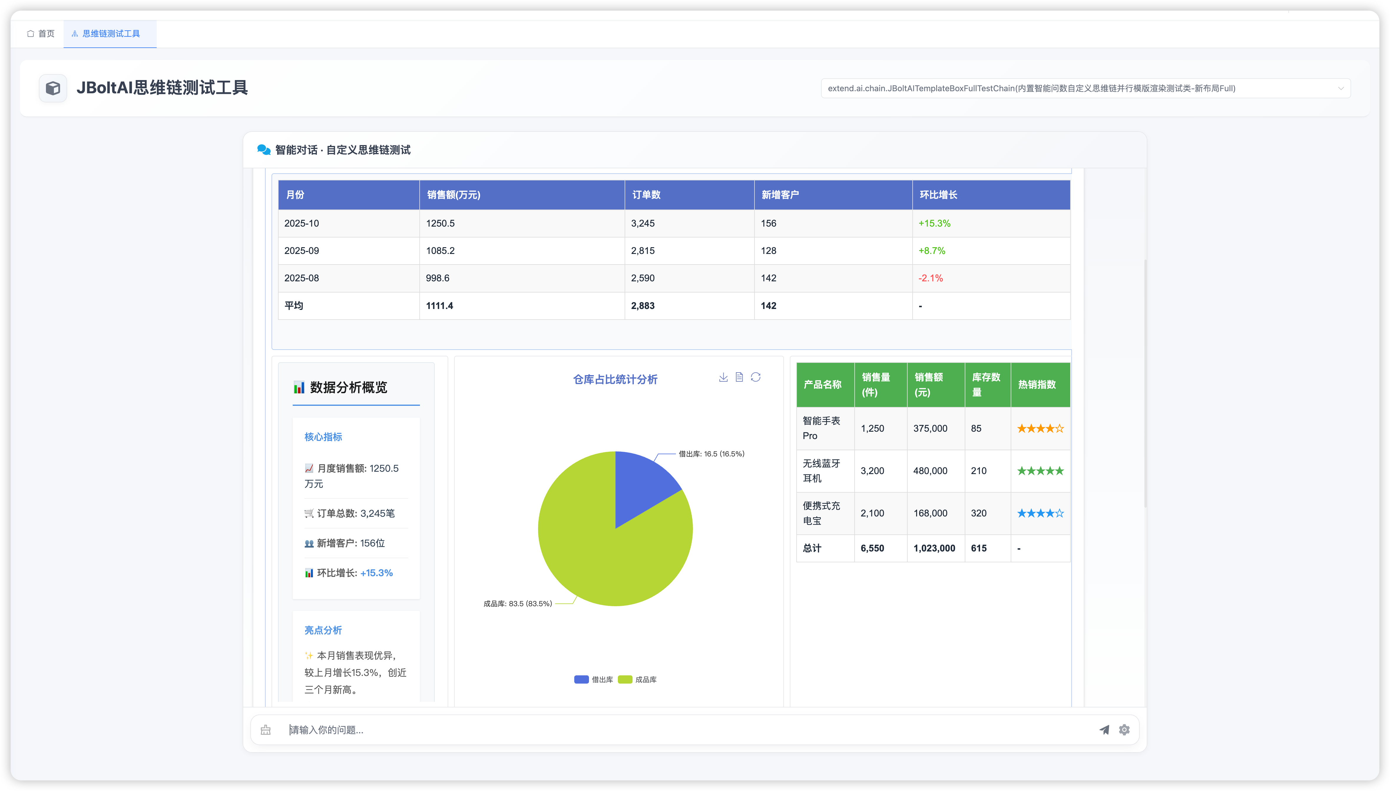 JBoltAI ChatBI 不仅能回答 "是什么" 的基础数据查询(如 "Q3 产品 A 的退货率"),还能解析 "为什么" 的关联分析(如 "退货率升高是否与物流时效相关"),通过数据关联模型生成归因报告,辅助用户挖掘数据背后的业务逻辑。