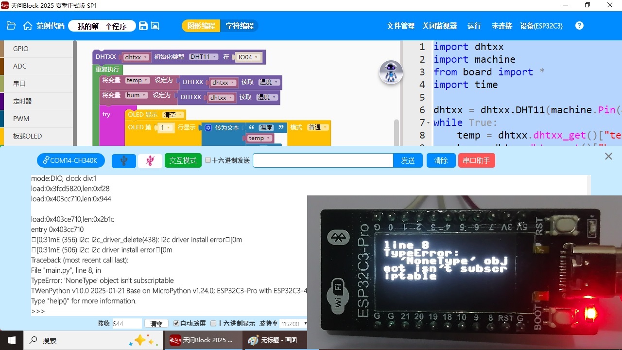 从错误信息中看出"NoneType"的对象无法创建,所以我一度以为是DHT传感器的驱动程序没有在开发板中安装成功。因为在电脑天问BLOCK中运行开发板中的main.py程序,程序就能运行成功,而从开发板中重启程序,则程序卡死。所以我曾一度坚信是因为这个DHT驱动库是我们在程序中添加的拓展驱动,可能在电脑的天问BLOCK中,有完整的驱动库;而开发板中可能是驱动库文件不完整,所以造成了从开发板启动程序出现了错误错误。