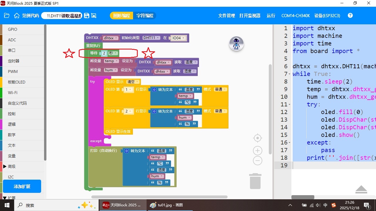 于是,我抱着试试看的态度,把while循环结构中的"延时2秒"的积木代码,从结构体的后面,移到了前面来。这样,程序完成DHT11的初始化后,进入循环函数,首先有一个2秒的延时,然后才是读取温湿度数据并显示。通过这样的调整,程序在初始化和读取数据的中间,就出现了一个2秒的延时了。