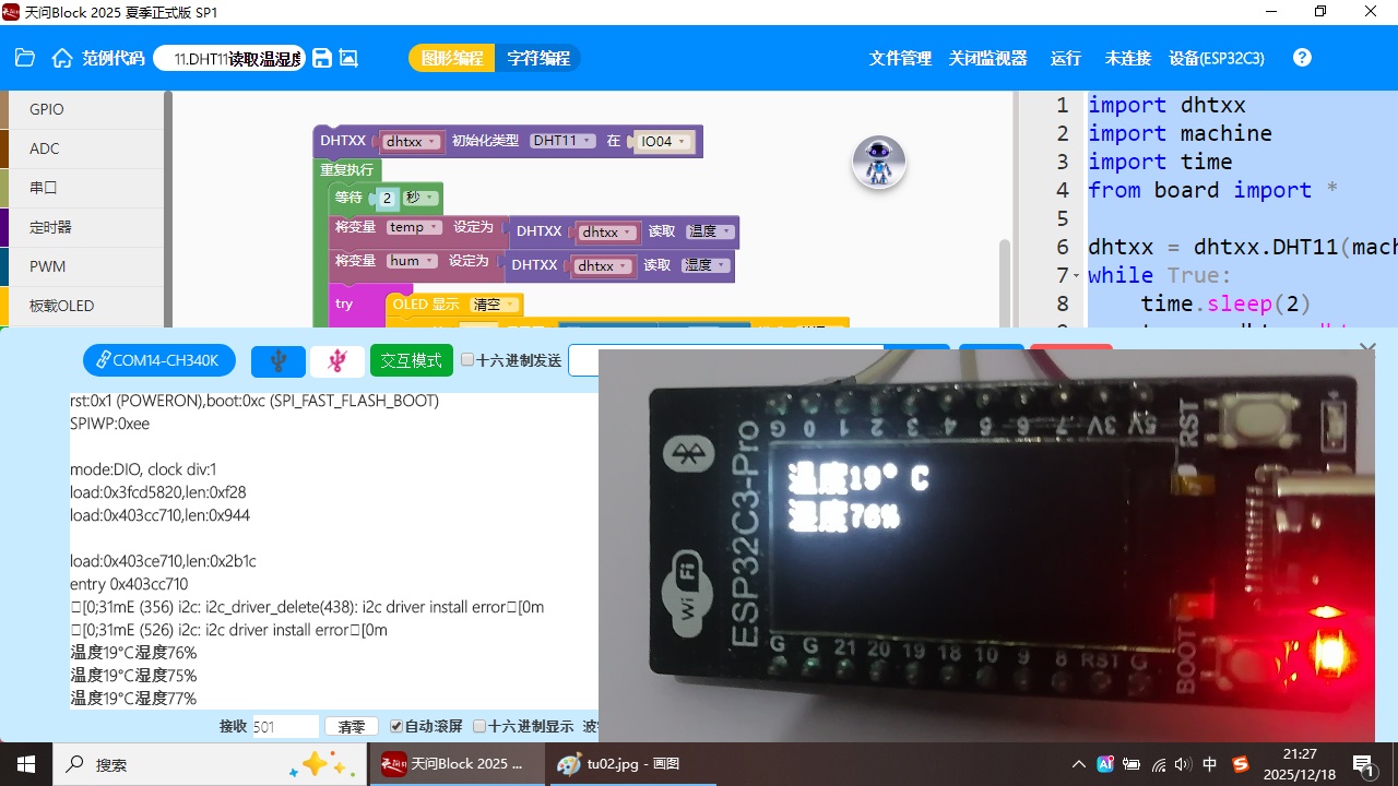 可是当我测试DHT11温湿度传感器程序的时候,在线模式就无法编译下载了。于是我想到既然在线编程模式不行,就改用下载安装天问BLOCK,采用本地编程的模式。我在天问BLOCK中,打开官方提供的DHT11示例程序,点击天问BLOCK窗口上方的运行按钮,可以看到程序写入到开发板模块中,而且也运行起来了,液晶屏中显示了温度和湿度的信息。