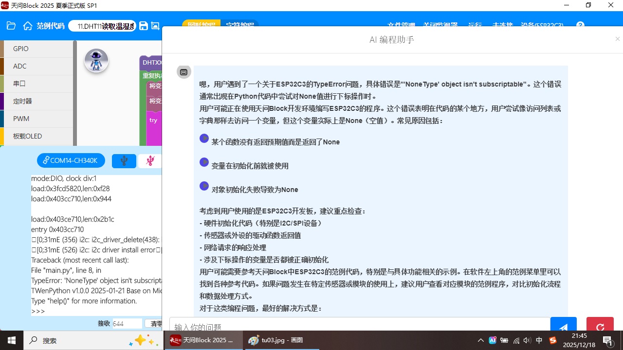 没办法,看来求人不如求己。我突然发现天问BLOCK中自带有一个智能体,于是试着向这个智能通提出问题,通过描述问题:"esp32c3驱动DHT11重启设备时出现运行错误NoneType",结果获得的答案是可能DHT的接线或硬件出现问题。这个设备时没有问题的,因为在天问BLOCK中运行,程序能跑起来了,不可能硬件有问题。