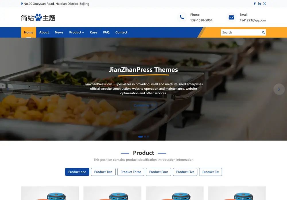 蓝色、黄色经典配色的wordpress外贸主题,适合工厂DTC品牌出海产品展示网站。