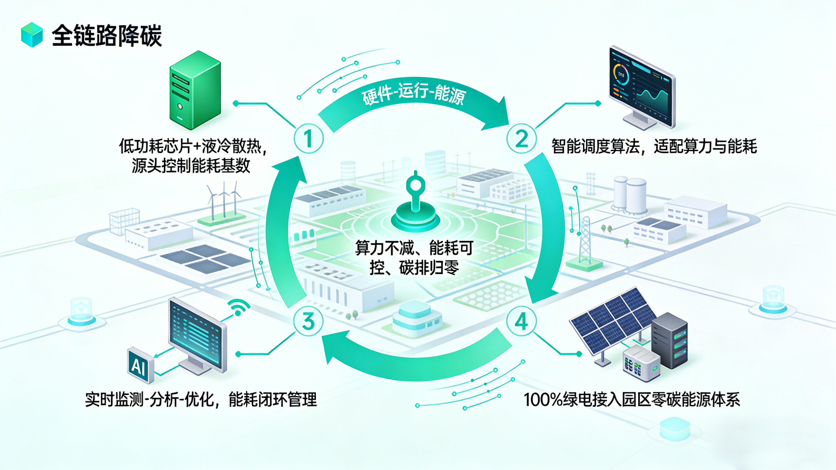 零碳园区边缘计算节点的能耗控制并非单纯降低运行功率,而是构建"硬件节能-运行优化-绿电供给-智能调控"的全链路方案,实现"算力不减、能耗可控、碳排归零"的目标。