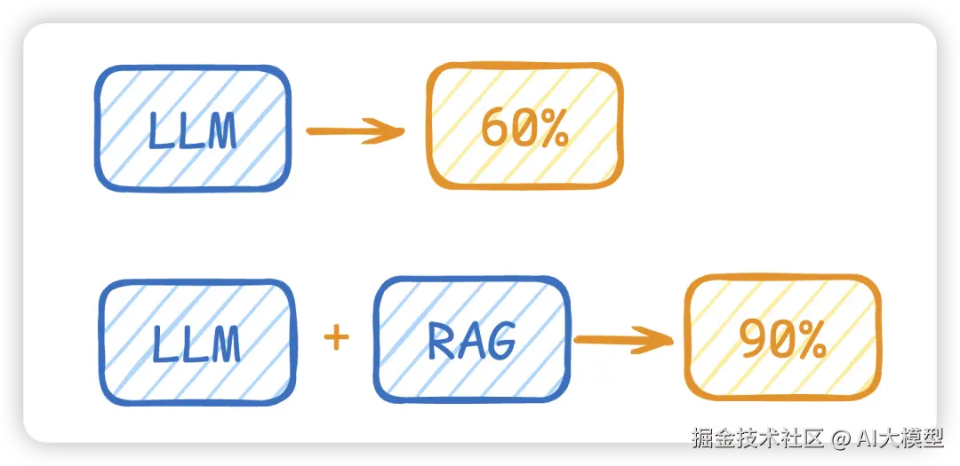 打个比方:LLM 在考试的时候面对陌生的领域,只会写一个解字(因为LLM复习也只是局限于特定的数据集),然后就准备放飞自我了,而此时RAG给了亿些提示,让LLM懂了开始往这个提示的方向做,最终考试的正确率从60%到了90%!